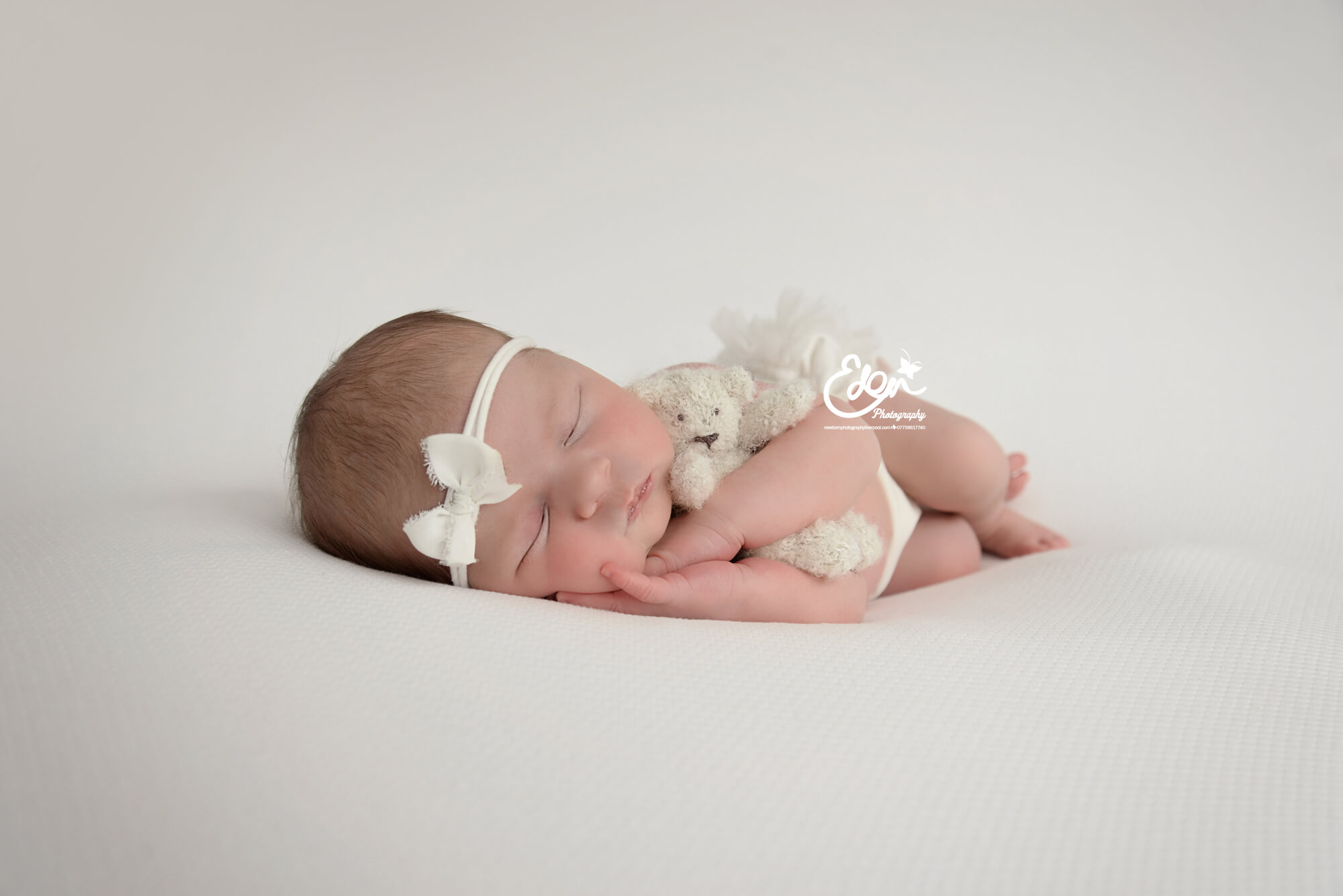 Callia’s Shoot – Newborn Photography West Derby. Say hello to little Callia! I spent a morning recently with this adorable baby girl for her studio newborn session. Callia and her mum came traveled from the West Derby area of Liverpool. Callia is so perfect and dainty. As usual, I love all the neutrals we used for her photo shoot. Mum choose some frilly white knickers which really suited her. I also introduced my hand-knit tiny fluffy teddy bear for one of the photos, which looks really sweet.